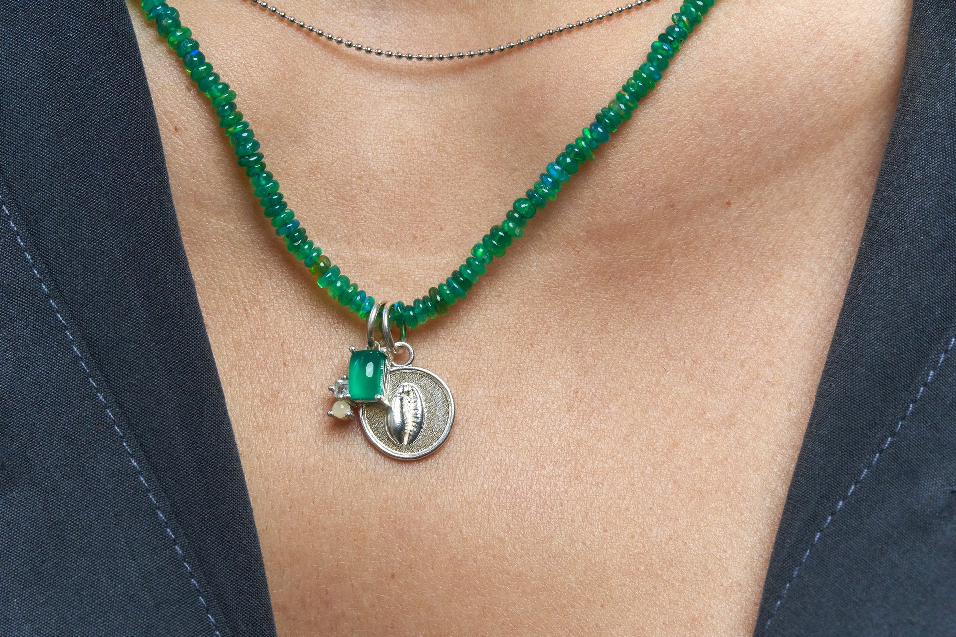 Smooth rounded green opal beads, strung with silk thread. One of our favorites to layer with chains and beaded necklaces.